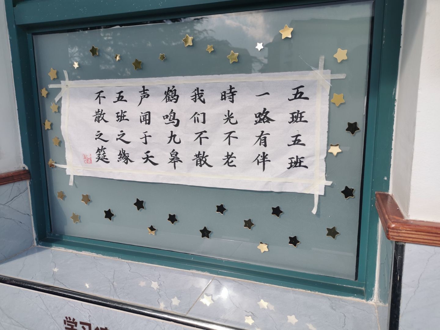 本次活动的第二名是高二(5)班。还未进教室,就能看到班级同学写的“五班之诗”,在群星的簇拥下绽放。另一侧墙上,有着属于他们共同的回忆——照片墙。29个同学的模样构成了这个家庭里最温馨的角落,在短短两个春秋中,他们不知不觉已经成为彼此最可靠的朋友。推开门,点点璀璨的繁星星月便会映入眼帘,每天清晨的第一束阳光斜射入教室,便会映在那一片金黄的海洋中,星月相辉,他们的一天便会从这里开始。墙壁的两侧则挂满了同学们的字画,同学们的才华被贴在墙上一览无余,而每月的优秀同学照片也会公示在旁边的“王者榜”,他们是我们学习的对象!最后的黑板报凝聚了班级的艺术碎片,也结合了同学们的想象力,成为一道靓丽又赏心悦目的风景线。上面是班规——“自律、团结、笃学、诚信”,这是每个五班人心里不会变的规矩;下面则是同学的心愿,以及对未来的憧憬。