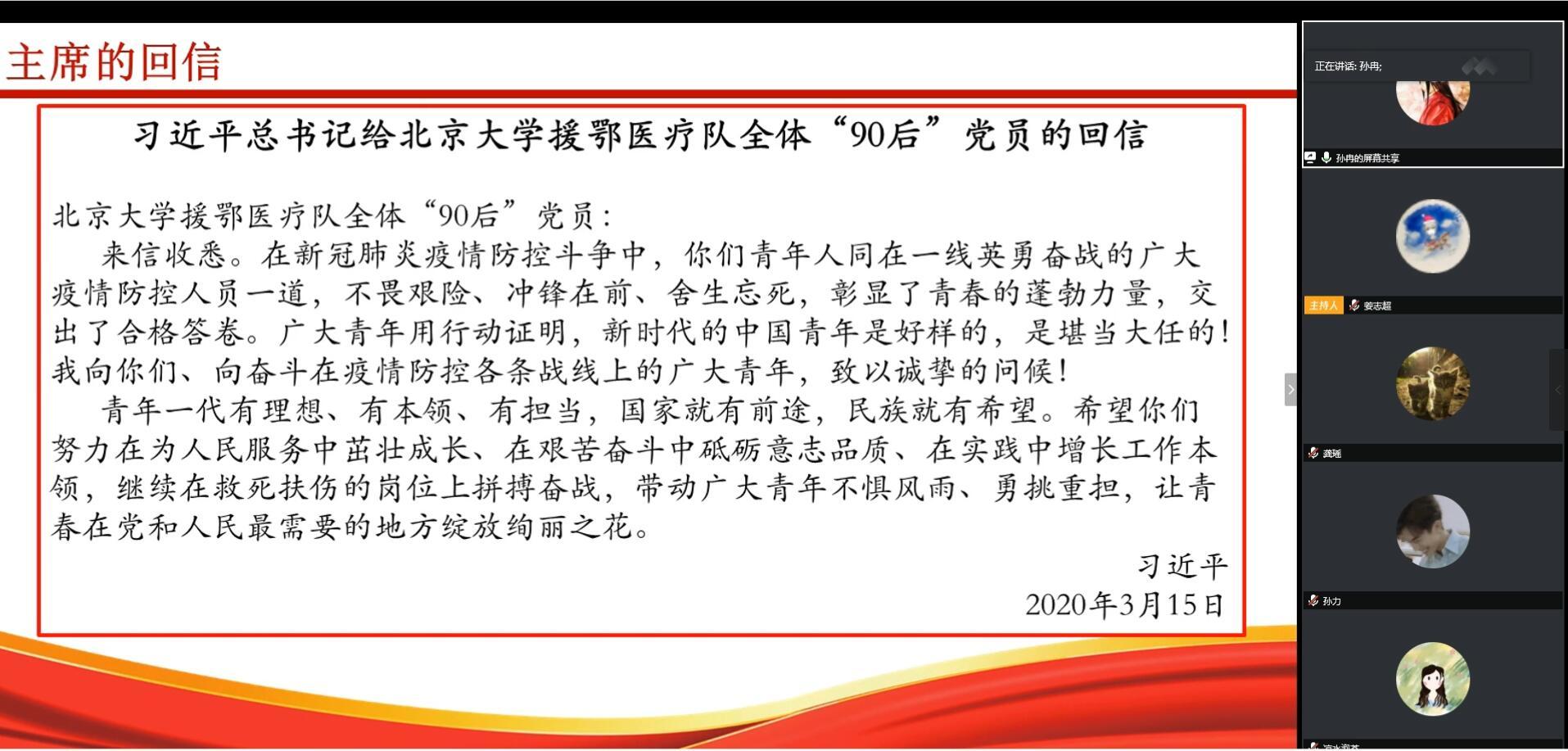 3月15日,习近平总书记给这批“90后”党员们发来回信,向他们和奋斗在疫情防控各条战线上的广大青年致以诚挚的问候。总书记表示,在新冠肺炎疫情防控斗争中,青年人同在一线英勇奋战的广大疫情防控人员一道,不畏艰险、冲锋在前、舍生忘死,彰显了青春的蓬勃力量,交出了合格答卷。广大青年用行动证明,新时代的中国青年是好样的,是堪当大任的。青年一代有理想、有本领、有担当,国家就有前途,民族就有希望。随后,习总书记还亲切勉励广大青年:“要让青春在党和人民最需要的地方绽放绚丽之花”,“要在为人民服务中茁壮成长、在艰苦奋斗中砥砺意志品质、在实践中增长工作本领,继续在救死扶伤的岗位上拼搏奋战”。共青团中央对于各级团组织和广大团员青年坚决贯彻落实习近平总书记重要指示精神,在打赢疫情防控阻击战中积极主动履职、有效发挥作用,也都提出明确的方向性要求。