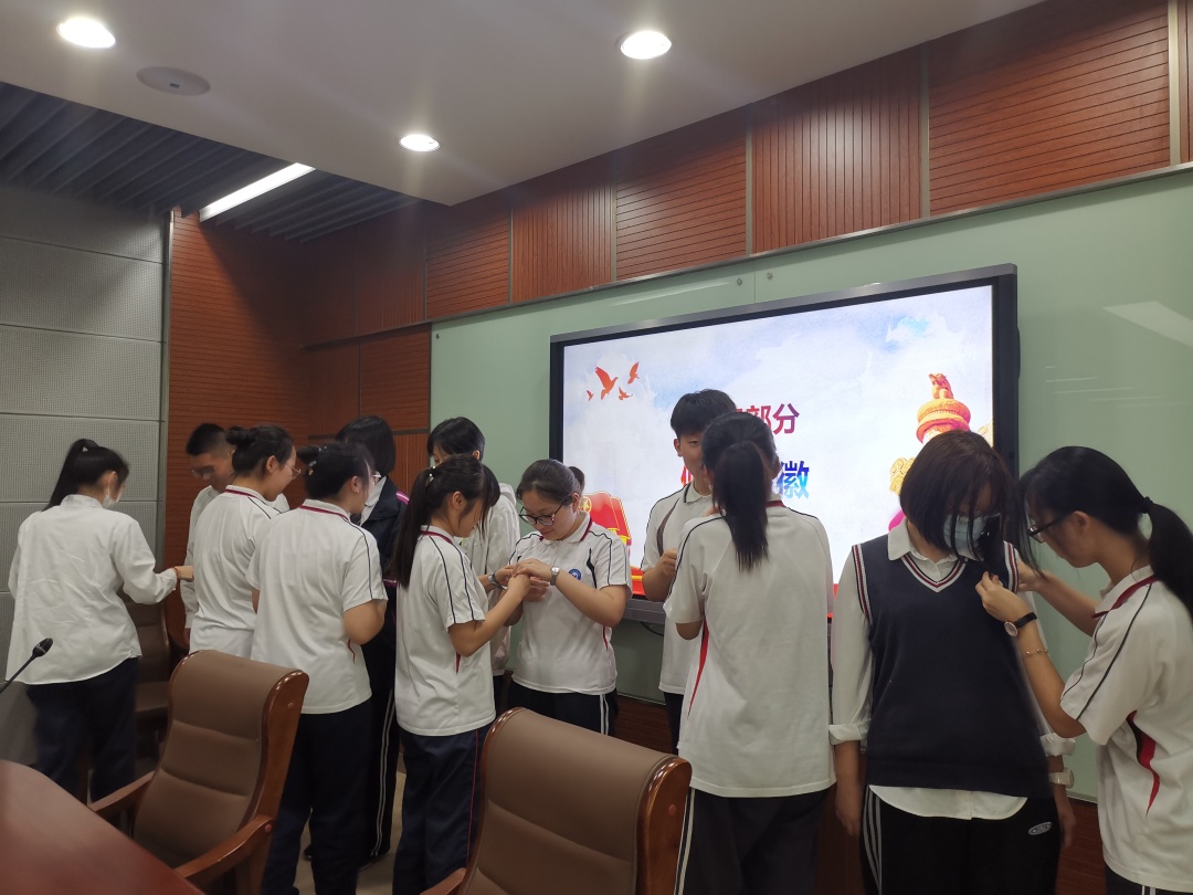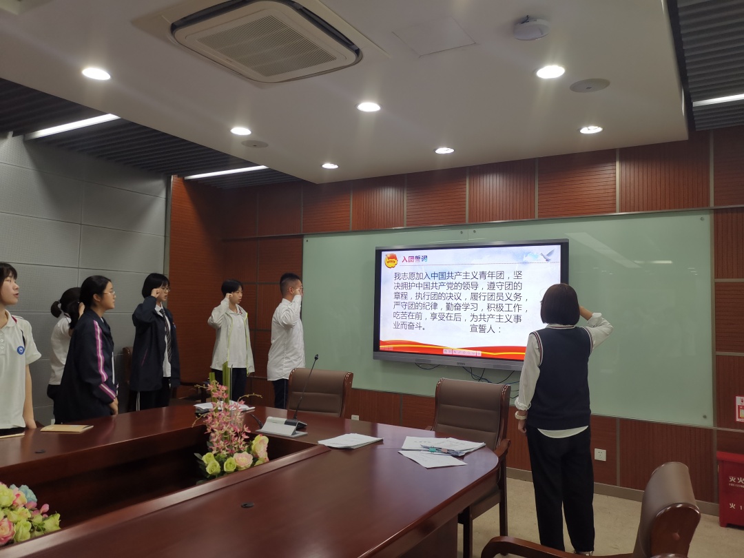 随后,各班的团支书给新团员们佩戴了团徽,佩戴完团徽的新团员们在金怡雯同学的带领下,面对团旗,举起右手,庄严宣誓。同学们的宣誓都铿锵有力,振奋人心,表达了要为共产主义事业奉献青春,要为青春全力拼搏的决心。团委书记许静老师向新团员表示祝贺,她提到入团是新的起点,而不是终点。希望新团员在日常生活中要牢记自己是一名共青团员,时刻注意用团员的标准来要求和鞭策自己,坚持积极参与学校组织的团员教育活动,使意识转化为行动。鼓励同学们树立远大理想,坚定青春信念,更加努力学习、全面发展,用实际行动谱写人生绚丽的青春之歌。