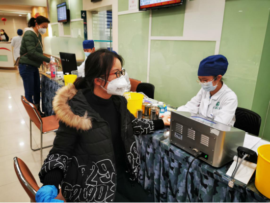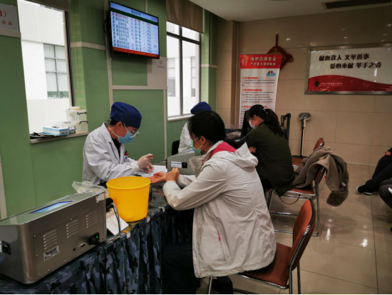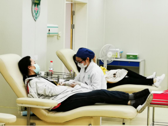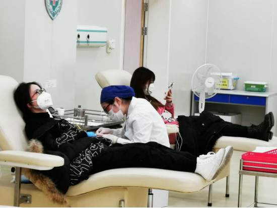 邢慧珺老师和高绪燕老师在完成填表登记、测血压和验血等一系列献血评估后,光荣献血。