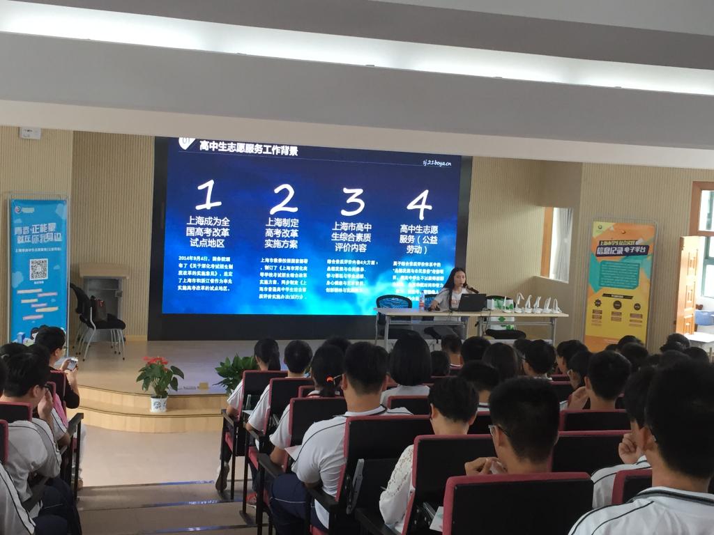 首先张老师老师对上海市高中志愿者服务的政策、背景、目的等做了说明。根据《中共上海市教育卫生工作委员会上海市教育委员会上海市精神文明建设委员会办公室上海市青少年校外活动联席会议办公室关于印发的通知(沪教委德〔2010〕2号)》规定:高中生志愿服务主要由学校团组织在市、区县两级学生社会实践基地(项目)中开展的集体性志愿服务活动。要求学生在高中阶段的志愿服务不少于60学时,即40个小时。个人参加的经历可记录在“上海市普通高中学生综合素质纪实报告”中的“自我介绍”部分。