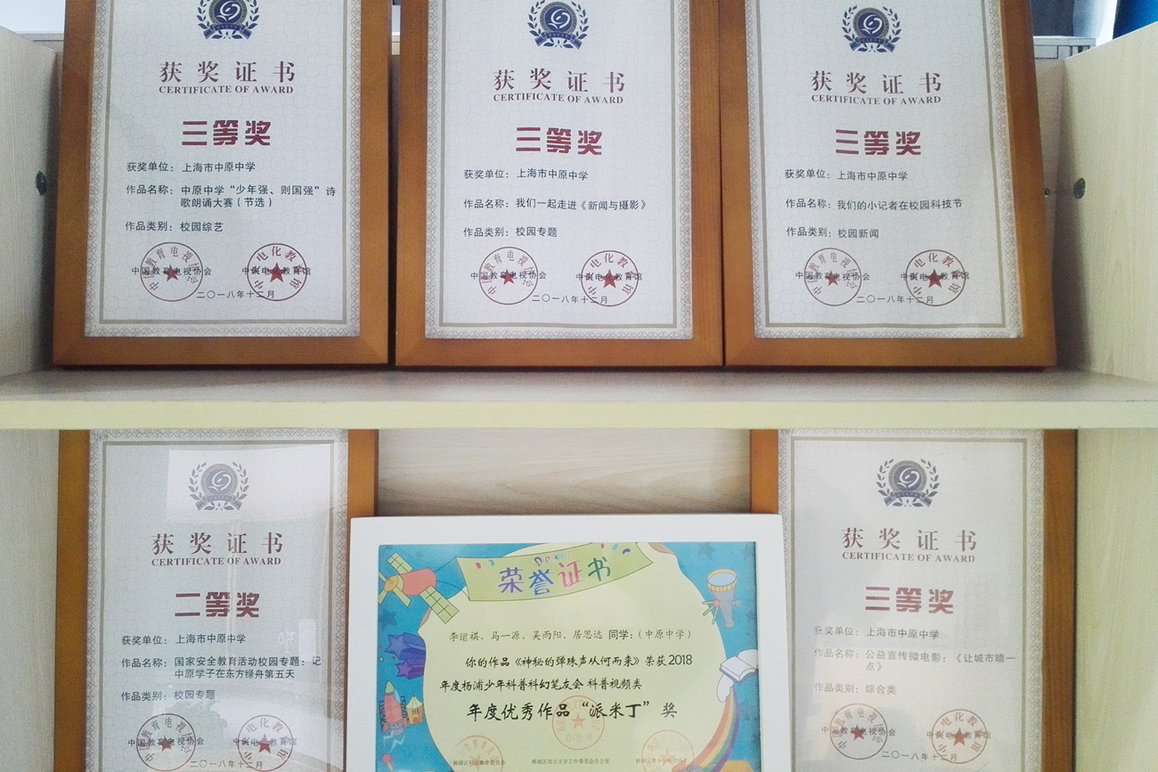 近年来,《新闻与摄影》创新工作室在负责人龙雨秋老师的带领下,致力于打造创新素养教育品牌、形成中原影像教育特色,做了大量的探索和实践,取得可喜的成绩。如影视方面的:《中原学子在东方绿舟第五天》新闻短片获得第十五届全国中小学校园影视节目评选二等奖,公益微电影《让城市暗一点》获得三等奖;科学发现微电影《神秘的弹珠声从何而来》,获得2018年杨浦区科普微视频评比 “派米丁”奖;《神秘的弹珠声从何而来》剧本获得“百年树人.电影阳光系列行动——2018年上海市中小学微电影大赛优秀奖”;科学发现微电影《银项圈的情愫》进入2019第九届上海市青少年校园影视创意实践活动“科技创新”微视频创作决赛阶段等等。