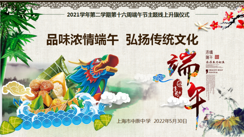 在疫情防控的特殊时期,迎来了端午节。上海市学校以“品味浓情端午 弘扬传统文化”为主题开展线上升旗仪式,品味端午节丰富的文化内涵,增强师生对继承与弘扬传统文化的认同感,激发爱国热情和民族自豪感。