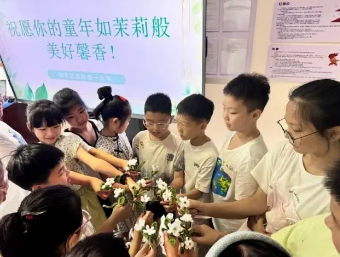 “茉莉花‘清香高雅 謙遜溫潤’的精力意向與我校‘和合共生 潤澤成長’的辦學理念非常符合。因而,茉莉花成為星橋壹小的校花。”星橋壹小黨總支書記胡紅芳介紹道,“校園將茉莉文明與學科課程、實踐活動相結合,以勞動實踐為載體,以‘中華古韻 六藝五育’為課程中心總軸,開設了‘茉莉工坊’這壹新樣態的實踐體驗課程。”